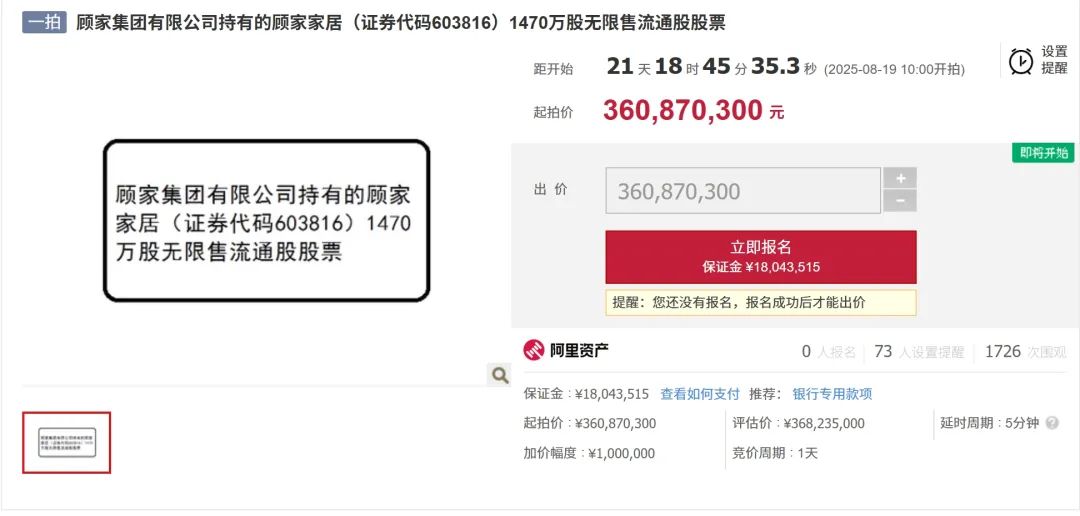 阿里资产披露的竞买公告显示升宏网,浙江省杭州市中级人民法院将于8月19日10时至8月20日10时止(延时的除外)在杭州市中级人民法院淘宝网司法拍卖网络平台上公开拍卖顾家家居1470万股无限售流通股股票,起拍价为3.61亿元。